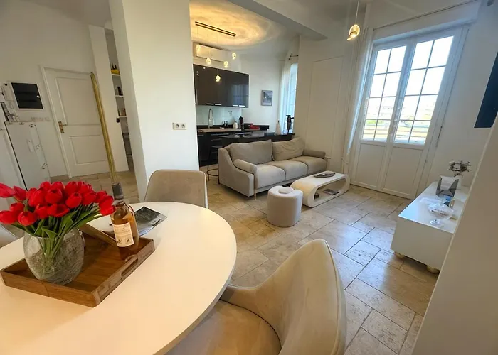 Die Unterkünfte bietet einen Blick auf den Garten und verfügt über Wohnbereich, einen Balkon und einen Ankleidebereich mit einer Klimaanlage und einer Waschmaschine. Das Appartement T3 Grand Standing A Juan Les Pins bietet den Gästen 1 Bad. Das Badezimmer ist zudem mit einem Haartrockner, kostenlosen Toilettenartikeln und Handtüchern ausgestattet.